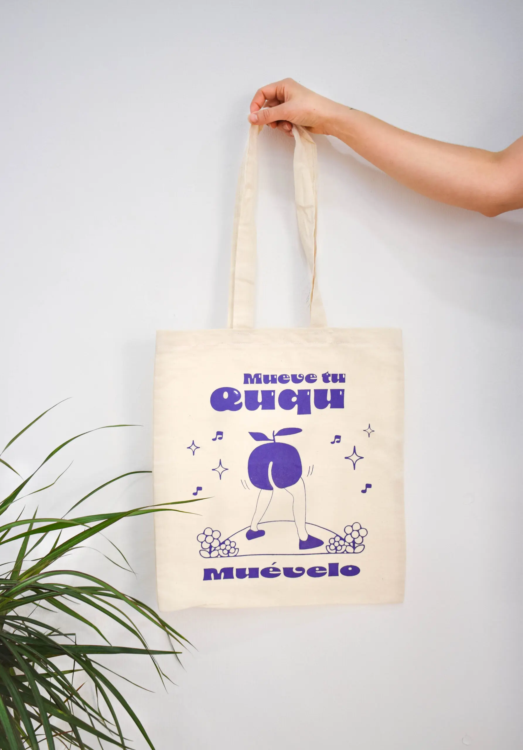 Tote bag blanca de dimensiones 38x 42.5cm con eslogan divertido Mueve tu ququ. Confeccionada en algodón ecológico. Producto nacional.